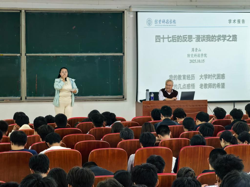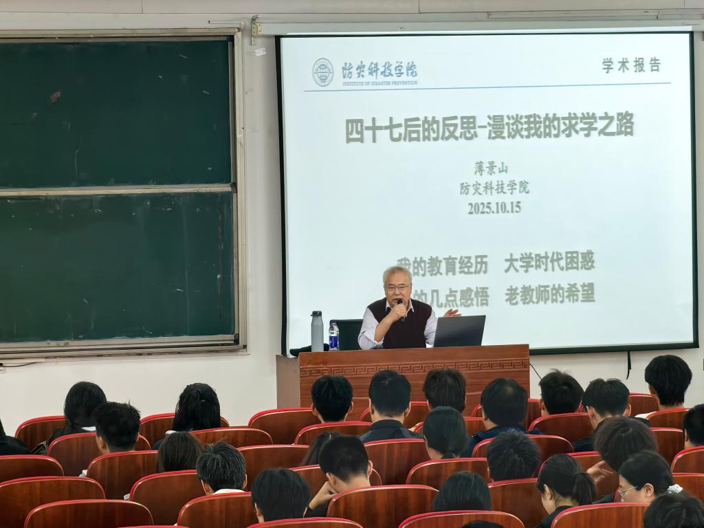 2025 年 10 月 15 日,为帮助新生明确大学学习方向、树立专业理想,增加对地球科学的热爱,地球科学与工程学院特邀薄景山教授为 2025 级全体新生开展了题为“四十七年后的反思——漫谈我的求学之路” 专题讲座。讲座由李琪老师主持,学院副院长孙珍军教授及部分教师代表参加。