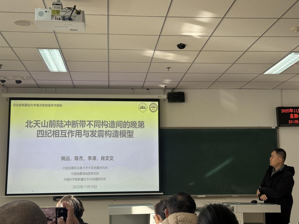 2025年11月10日上午,新疆地震局姚远研究员应河北省地震动力学重点实验室、廊坊市地球探测与信息技术重点实验室、地球科学与工程学院的邀请,为学校师生作了题为“北天山前陆冲断带不同构造间的晚第四纪相互作用与发震构造模型”的学术报告,地球科学与工程学院部分师生参加了学术报告会,报告会由吴传勇教授主持。
