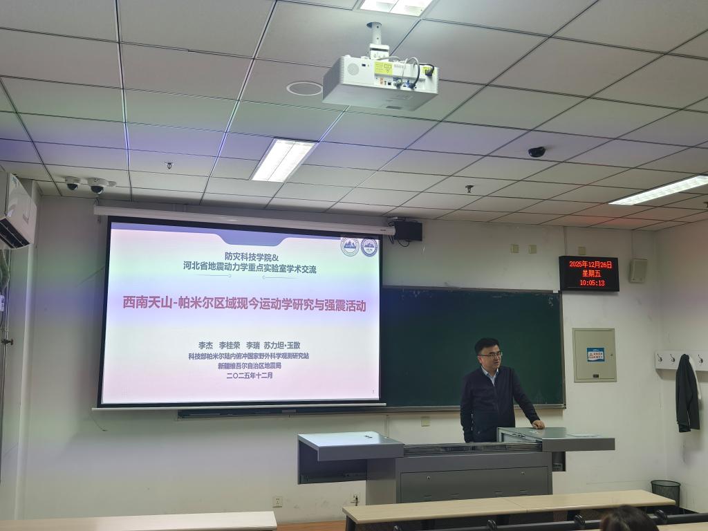 2025年12月26日上午,新疆地震局李杰正高级工程师应河北省地震动力学重点实验室、廊坊市地球探测与信息技术重点实验室、地球科学与工程学院的邀请,为学校师生作了题为“西南天山-帕米尔区域现今运动学研究与强震活 动”的学术报告,学校部分教师和研究生参加了学术报告会,报告会由地球科学与工程学院吴传勇教授主持。